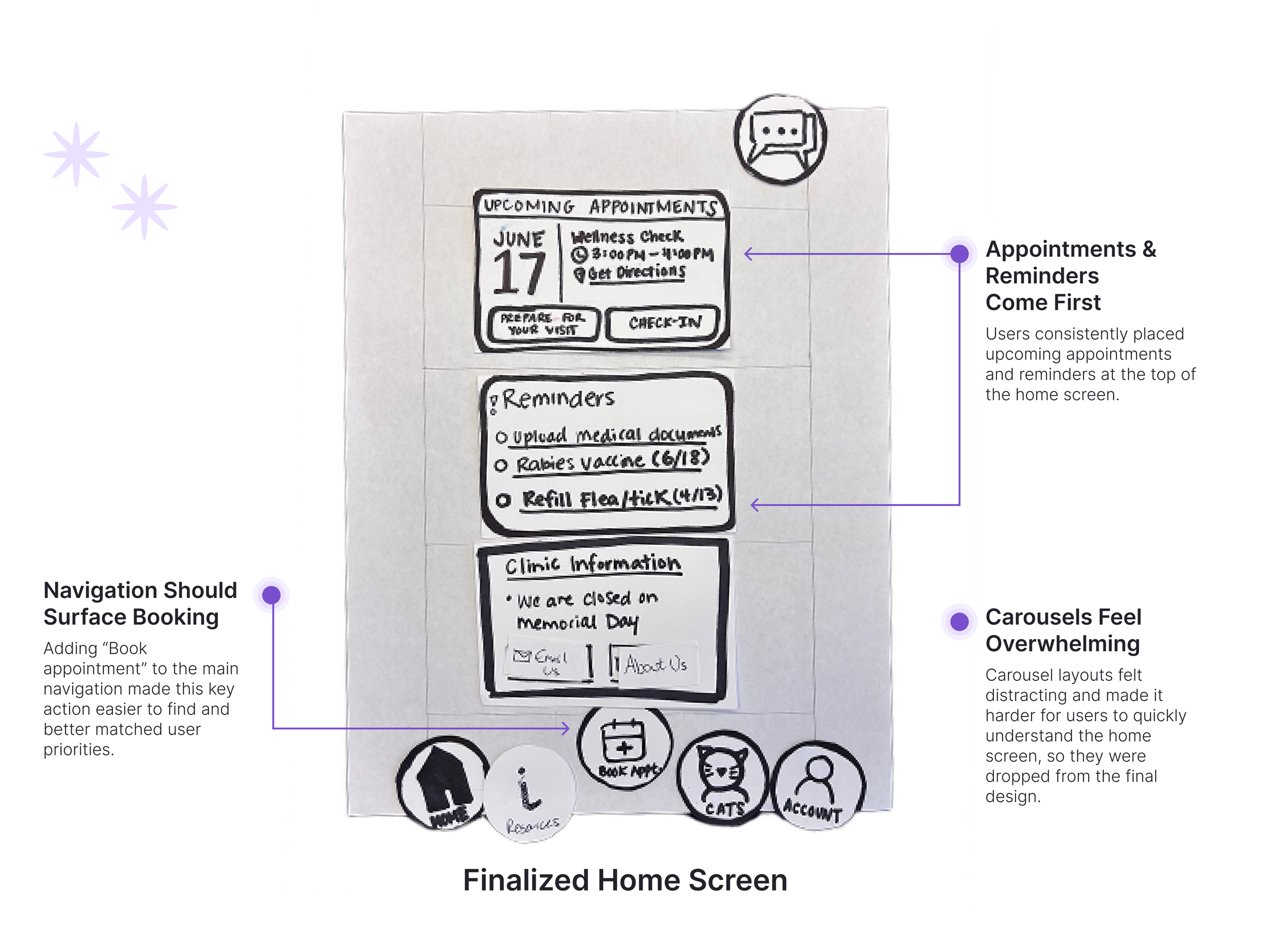 Booking, check in, and pre‑visit prep already happen through digital channels, so improving them was the fastest way to reduce client anxiety and set clearer expectations without changing the physical space. I focused early design work on these moments instead of trying to fix the entire visit at once, turning it into a fun challenge to use screens to spotlight the clinic’s cat‑centric care and staff while still feeling like a warm, small business.