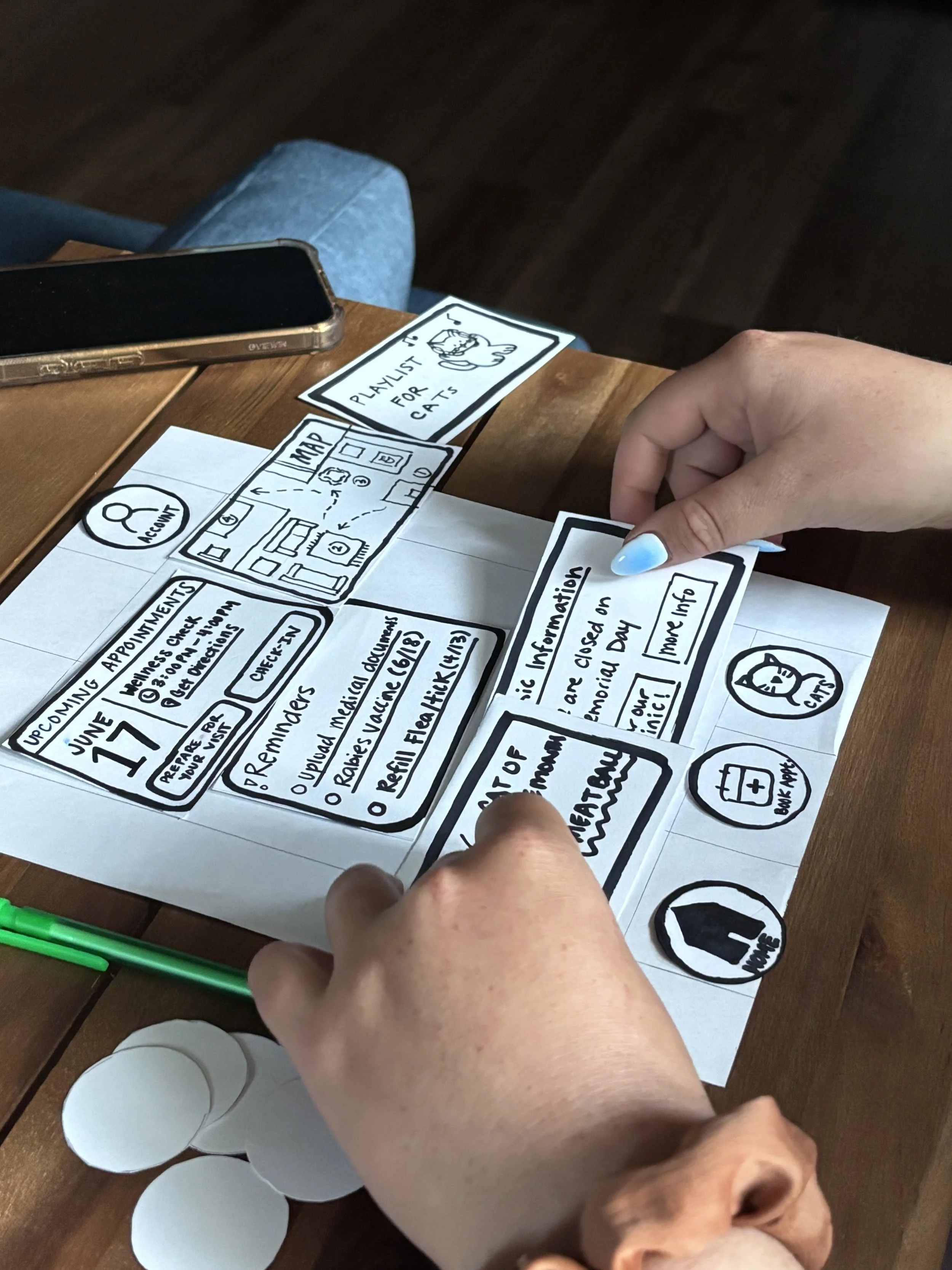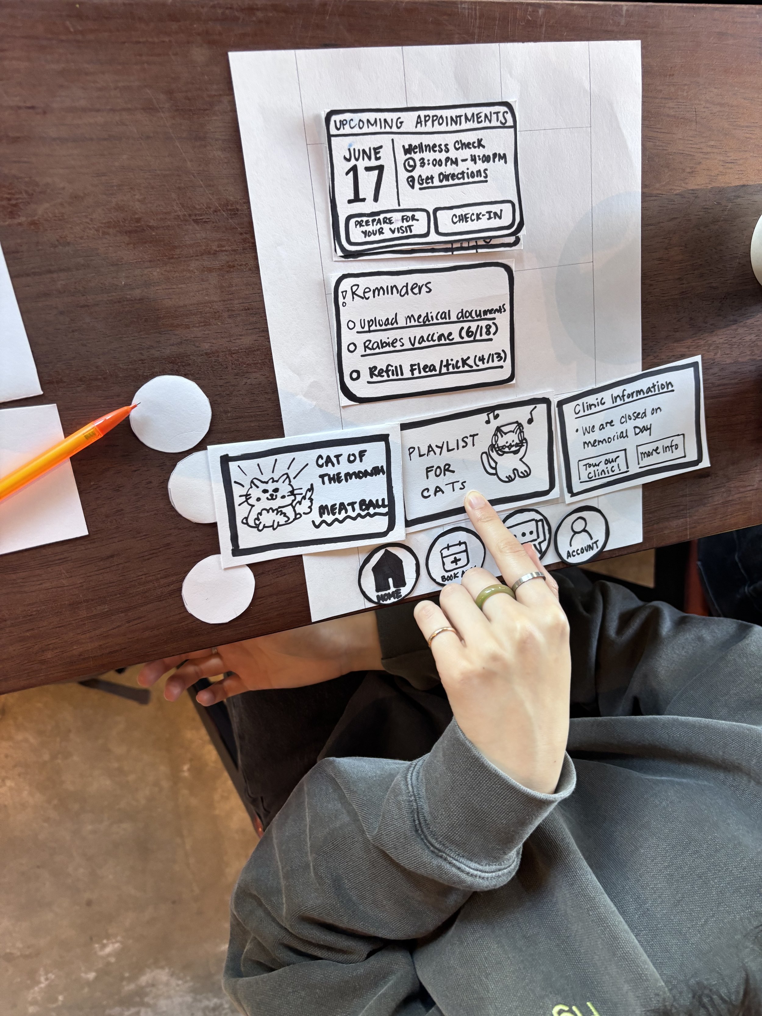 As a team, we wanted to do a card sort to understand what information cat owners would prioritize in an app. Because we had limited time, I recommended that our team use a paper prototype for the first round of testing.