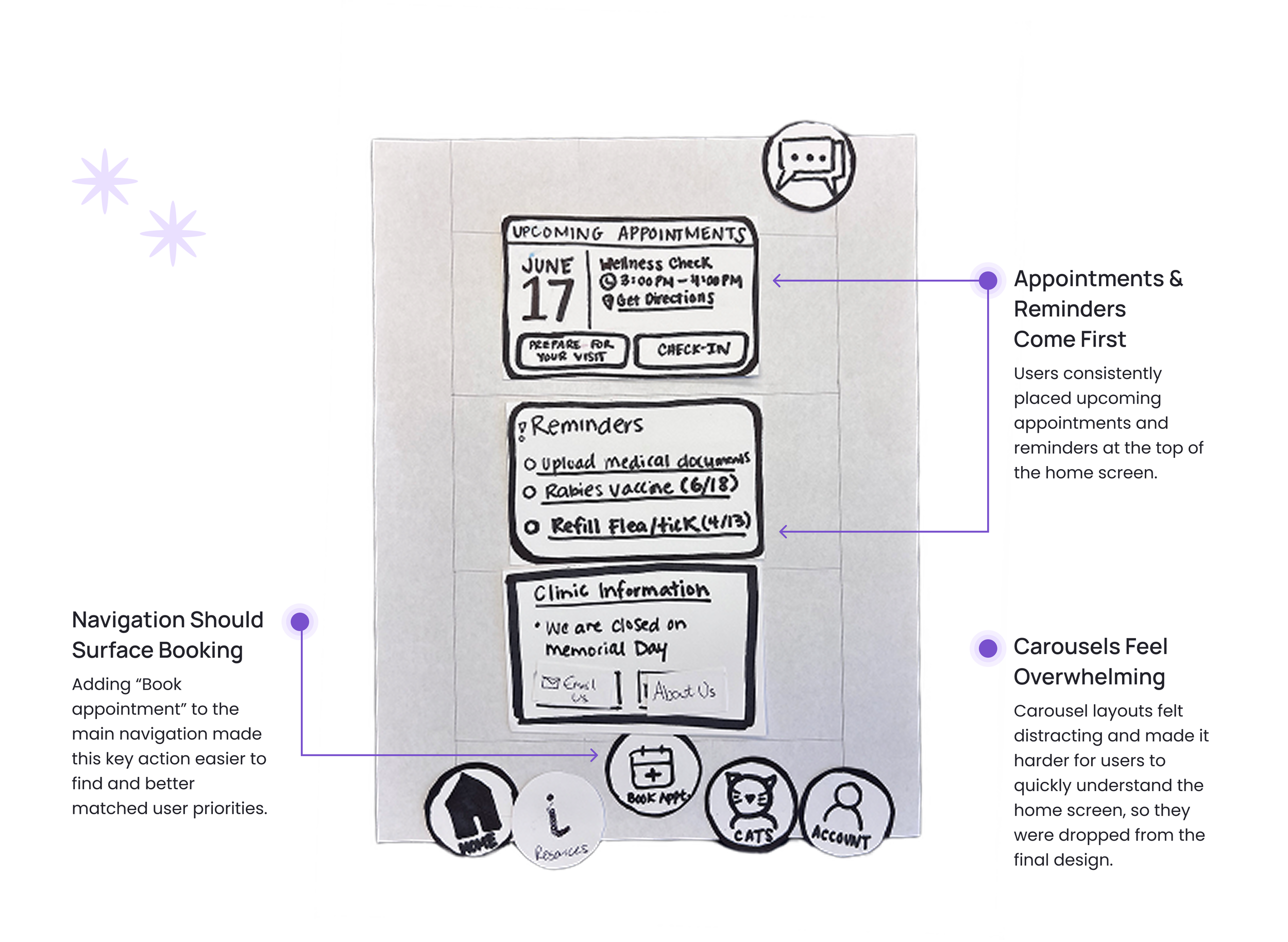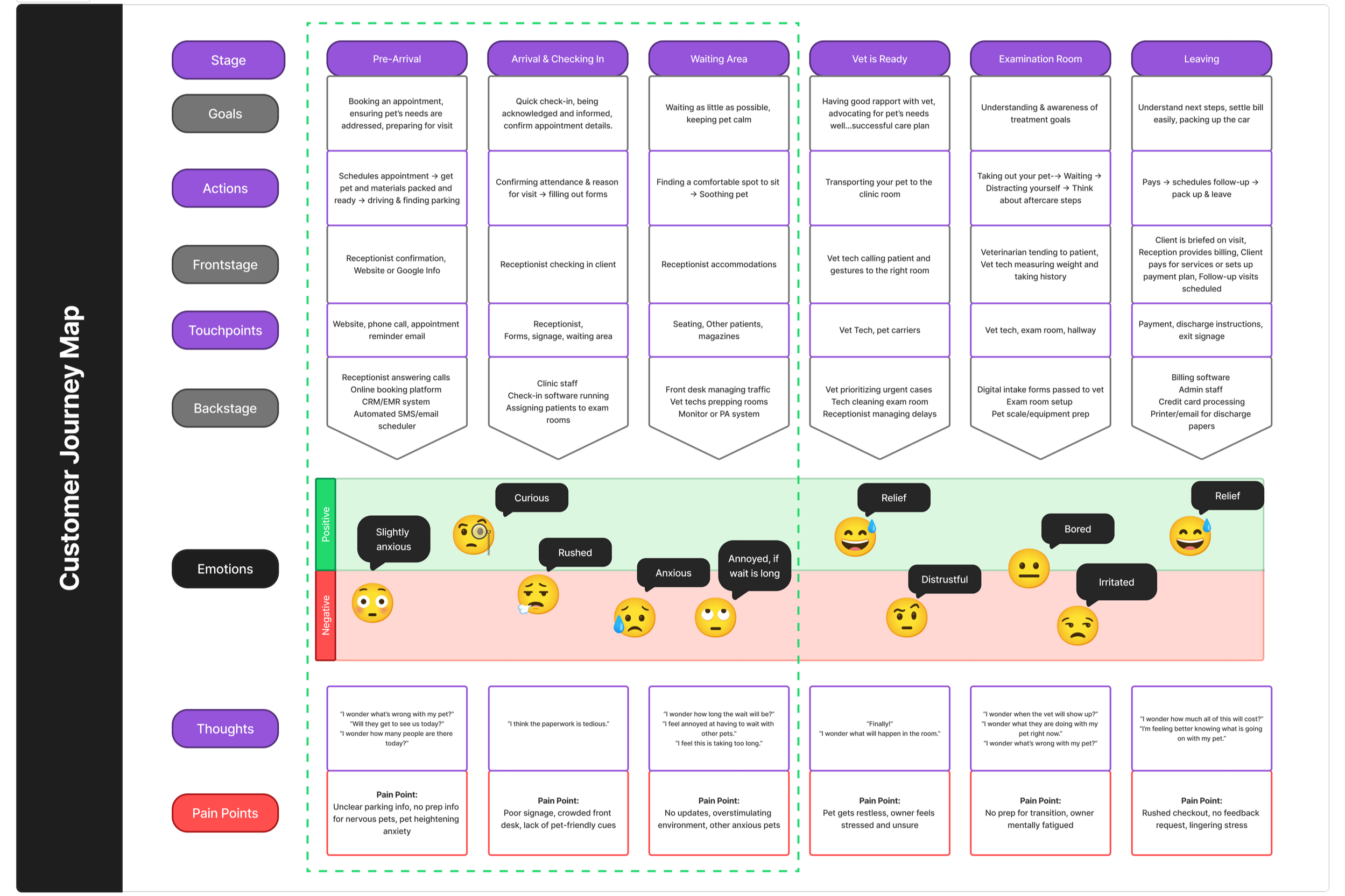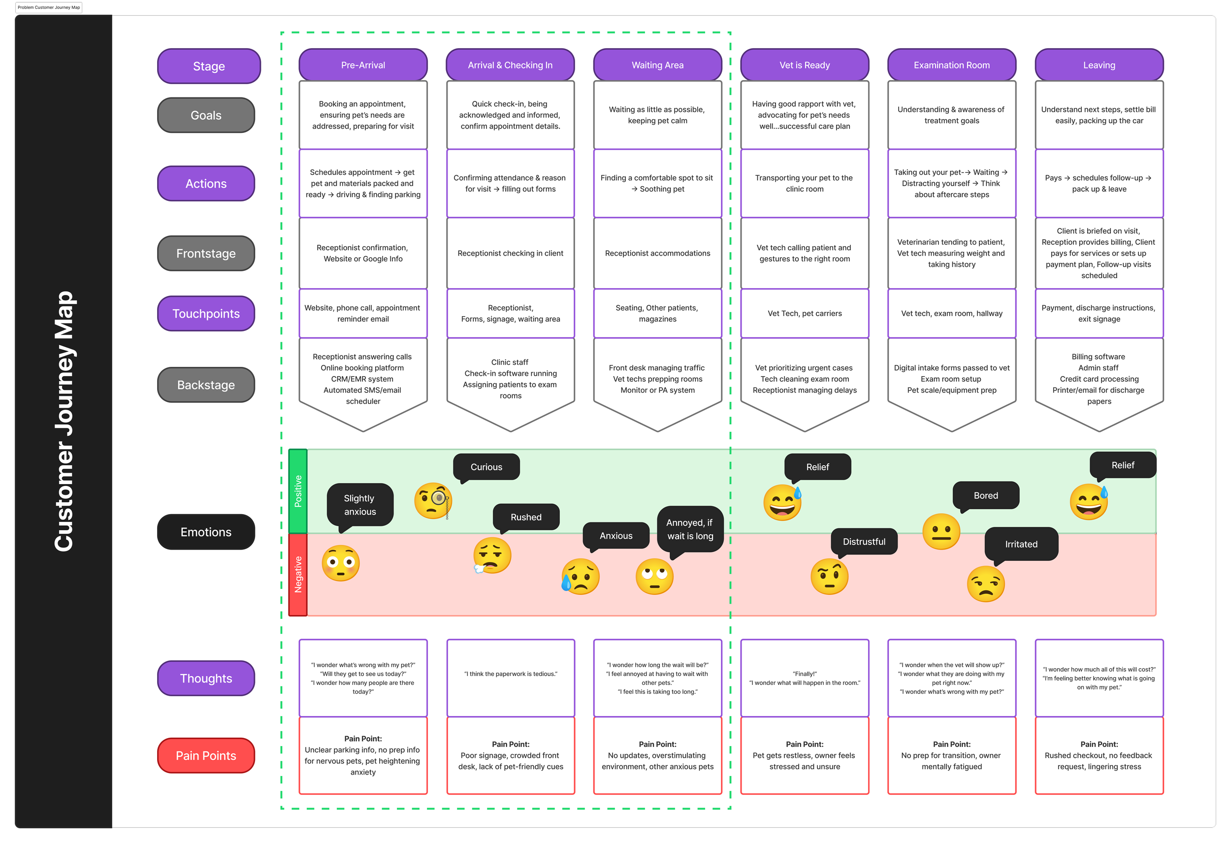 To understand how cat owners experience the clinic and what drives their stress and decision-making, we used several research methods to identify pain points and improvement opportunities. Here’s how we approached our study and what we aimed to learn:
