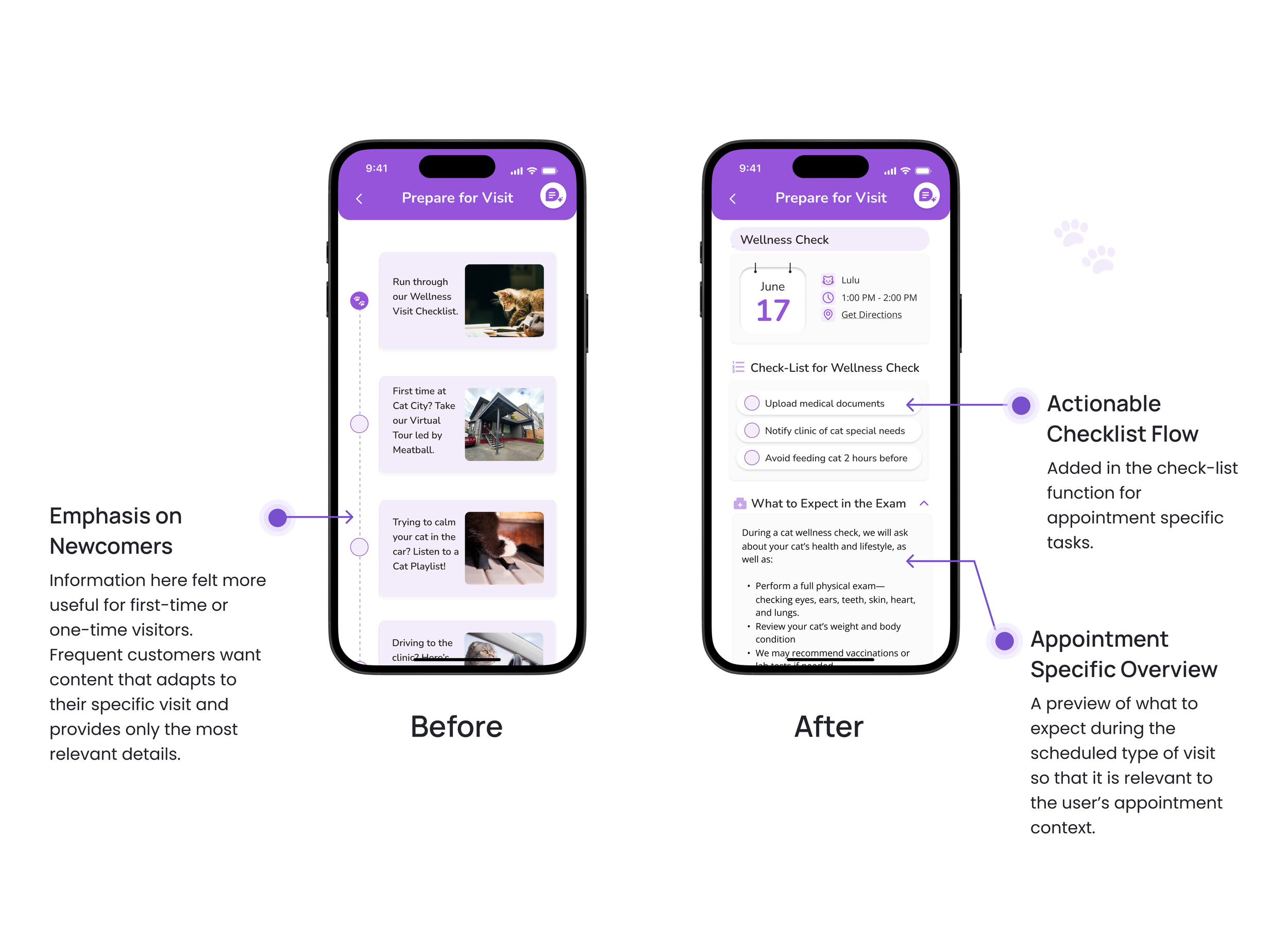 City Cat app puts booking, pet reminders, and exam checklists in one place, giving owners everything they need to feel confident and ready for every visit.