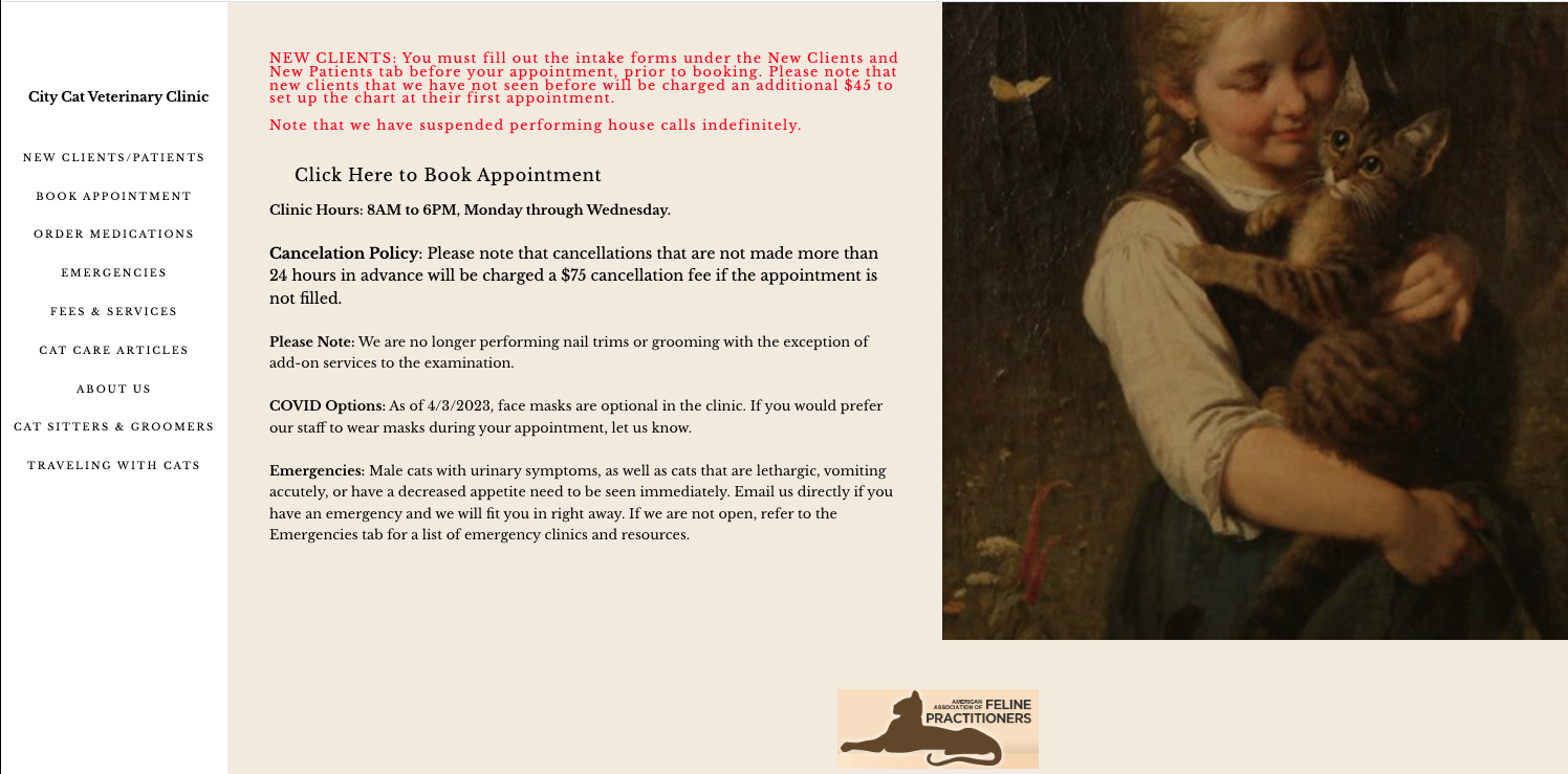 Highlight City Cat’s unique philosophy cat‑centric practice and homey charm of a small neighborhood clinic.