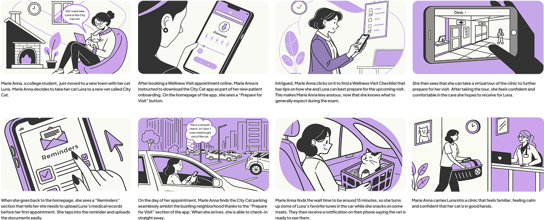 The idea that resonated strongly amongst the team was “What if taking a cat to the vet as akin to flight check-in or a visit to a premium airport?” This metaphor draws on the parallels of pre-visit chaos, while leveraging the way airlines/airports have mastered preparing and comforting passengers before their journey.